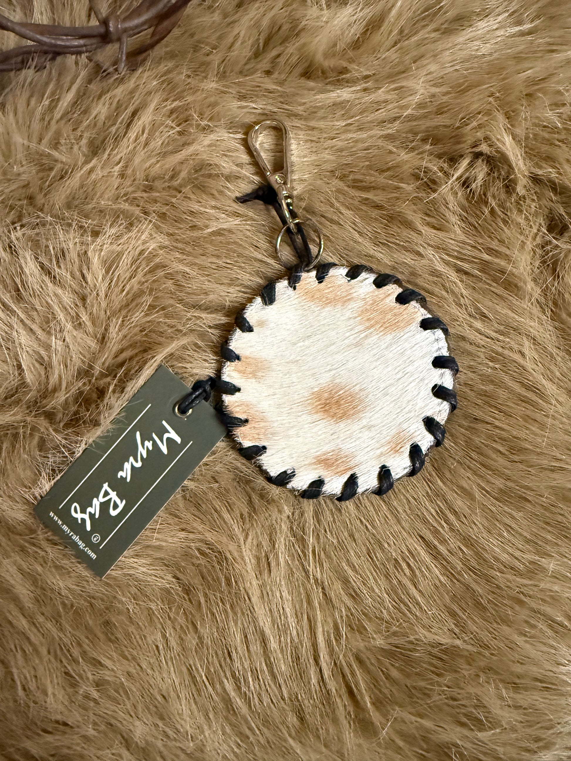 These cowhide key rings are quality made and make traveling fun! They are made with Genuine Brown and White cowhide and have a Black and White cowhide star in the center. You can personalize it by adding a custom brand!
